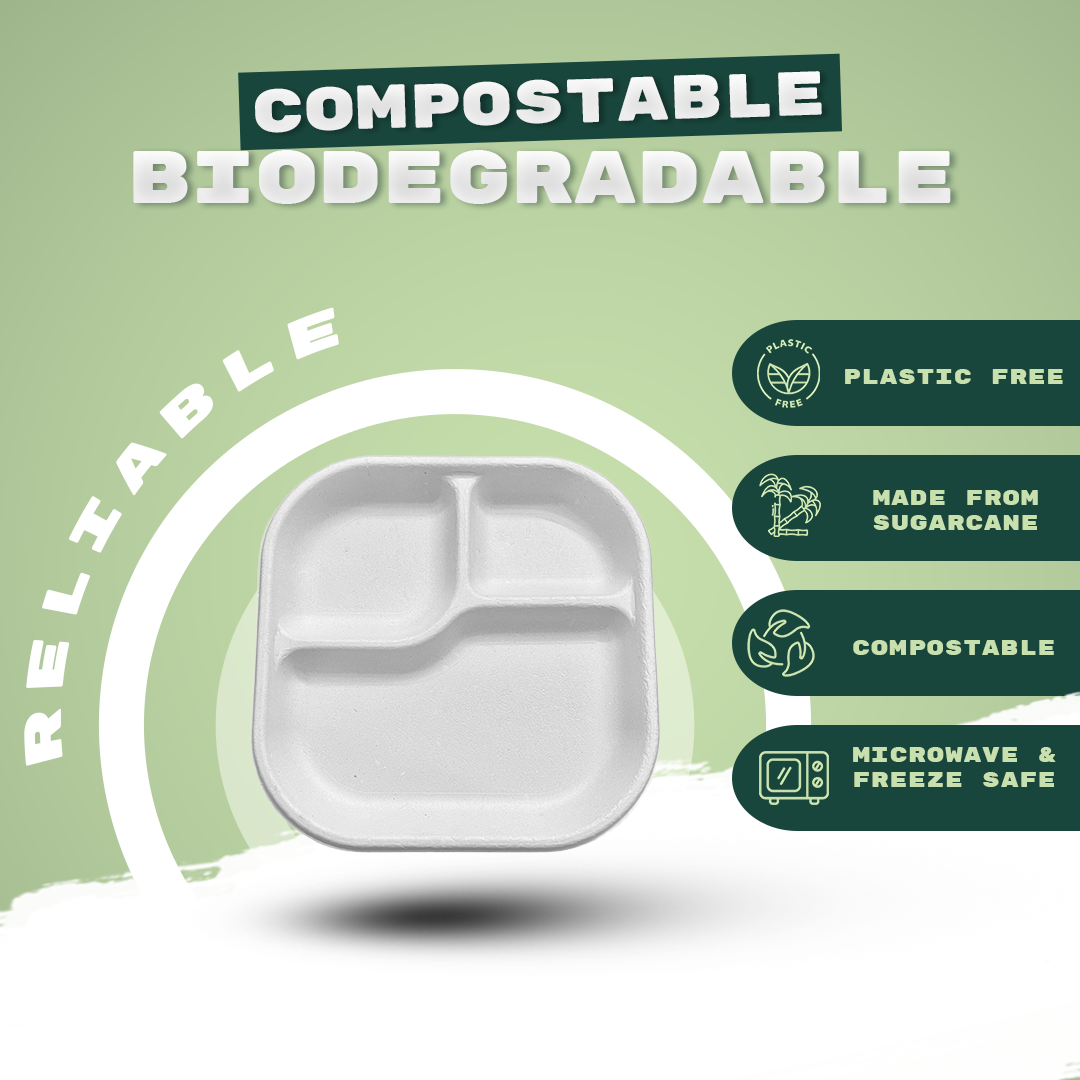 1. Specifications: Material:Bagasse (Sugarcane Pulp), Weight: 18 grams per plate, Color: White, Shape: Square, Compartment: 3, Pack Size: 25 Pieces