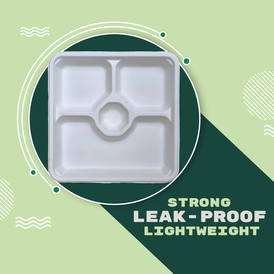 1. Specifications: Material:Bagasse (Sugarcane Pulp), Weight: 20 grams per plate, Color: White, Shape: Square, Compartment: 3, Pack Size: 25 Pieces