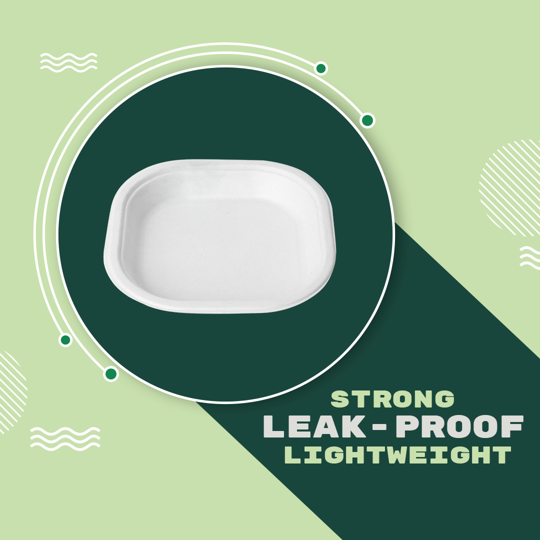 1. Specifications: Material:Bagasse (Sugarcane Pulp), Size: 6 inch, Weight: 6.5 grams per plate, Color: White, Shape: Square, Pack Size: 25 Pieces
